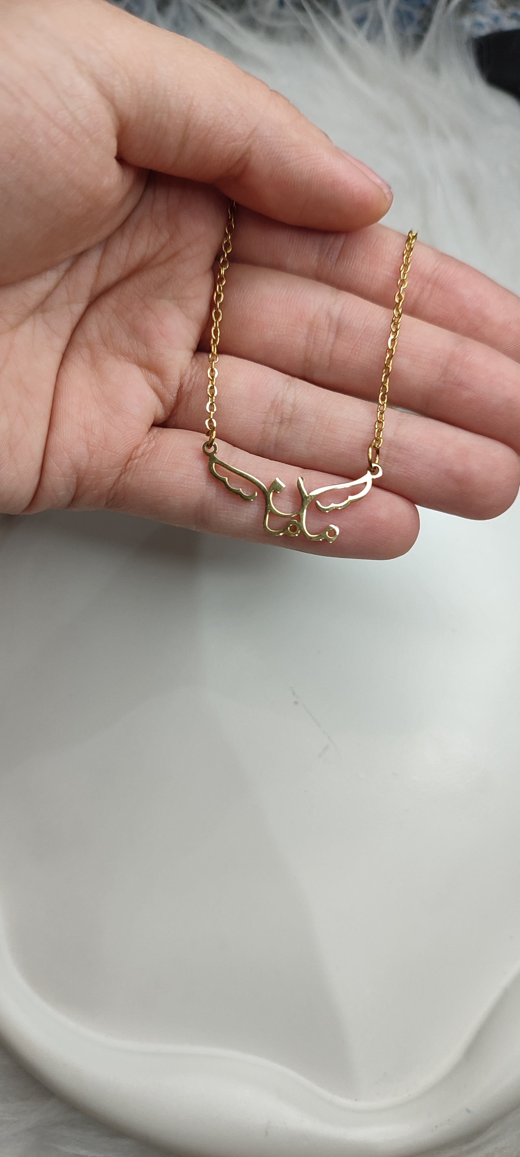 عنصر تزئینی: در دو طرف نام، طرح بالهای کوچک (Angel Wings) وجود دارد که به پلاک جلوهای فانتزی و نمادین بخشیدهاند.