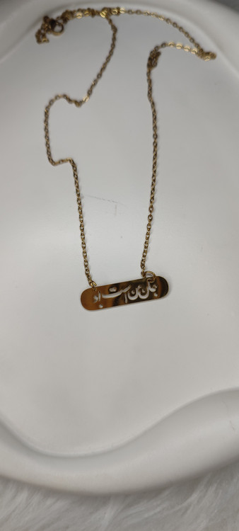نوع محصول: گردنبند آویزدار با پلاک متنی افقی (Bar Necklace).