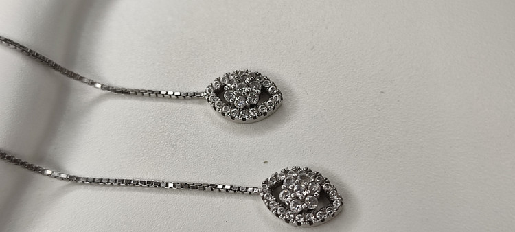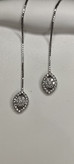 نوع گوشواره: گوشواره بخیهای یا نخی (Threader Earrings)، که شامل یک زنجیر نازک است که از سوراخ گوش عبور کرده و آویز در دو طرف آویزان میماند.