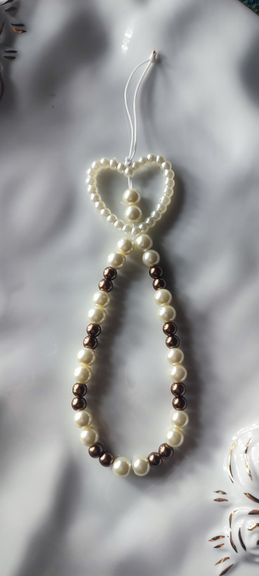ادامهی آویز به صورت یک حلقه کشیده و اشکیشکل است که مهرههای کرم/صدفی را با مهرههای کوچک قهوهای براق ترکیب کرده است. این کنتراست رنگی بین مرواریدهای روشن و مهرههای شکلاتی تیره، جلوهای شیک و مدرن به آویز بخشیده است. این آویز از یک بند سفید نازک آویزان است و میتوان آن را به گوشی موبایل، کیف یا به عنوان تزیین آویخت.