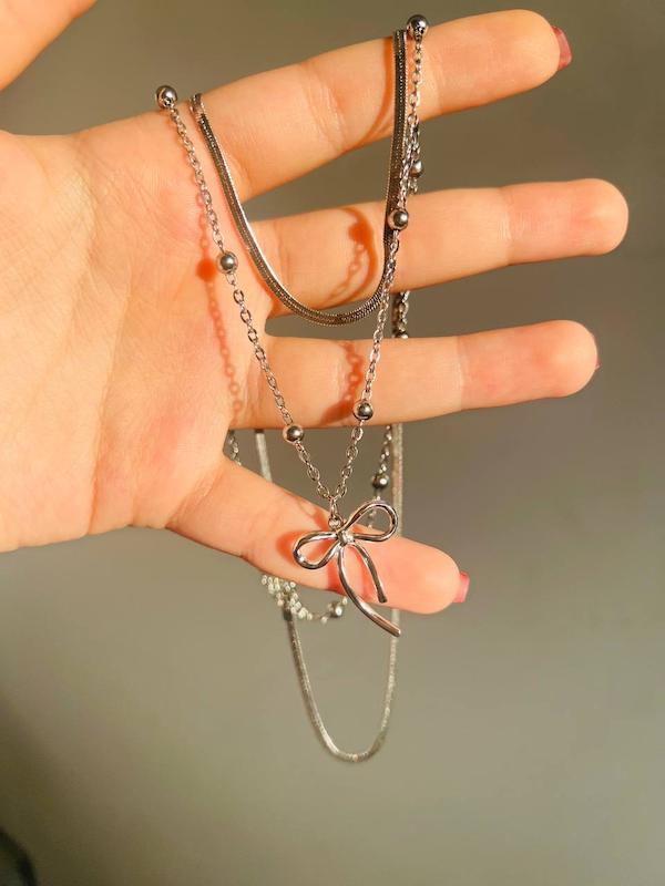 آویز تزئینی: به زنجیر نازکتر، یک آویز پاپیونی (Bow Charm) آویزان است.