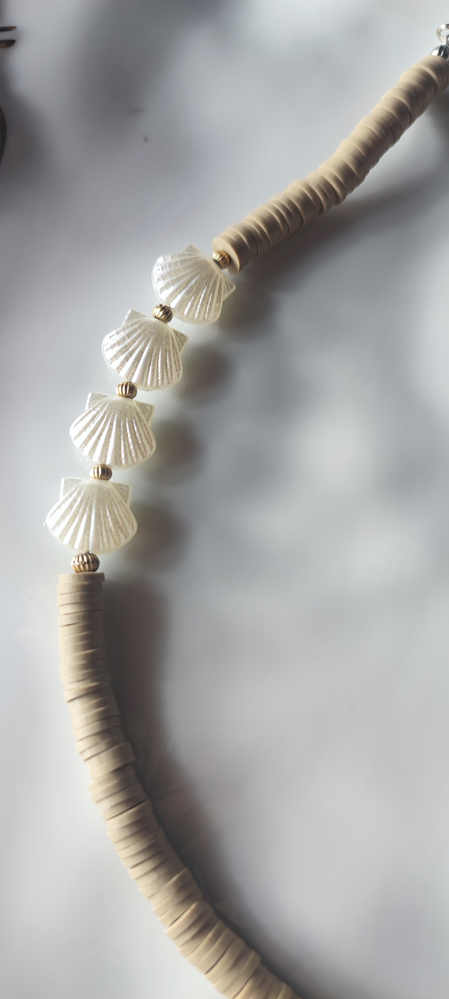 تزیینات صدف: در دو طرف گردنبند، قطعاتی از مهرههای صدفی سفید شفاف که شکل صدف اسکالپ (Scallop Shell) را دارند، به صورت متوالی استفاده شدهاند. در میان هر صدف، یک مهره کوچک طلایی برای درخشش بیشتر قرار گرفته است.