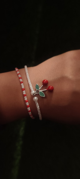 رشته دوم: رشتهای از مهرههای ریز سفید است که یک آویز گیلاس 🍒 به آن متصل شده است. آویز گیلاس با رنگ قرمز پررنگ و برگهای سبز میناکاری شده، نقطه کانونی و جذابیت اصلی مجموعه است.