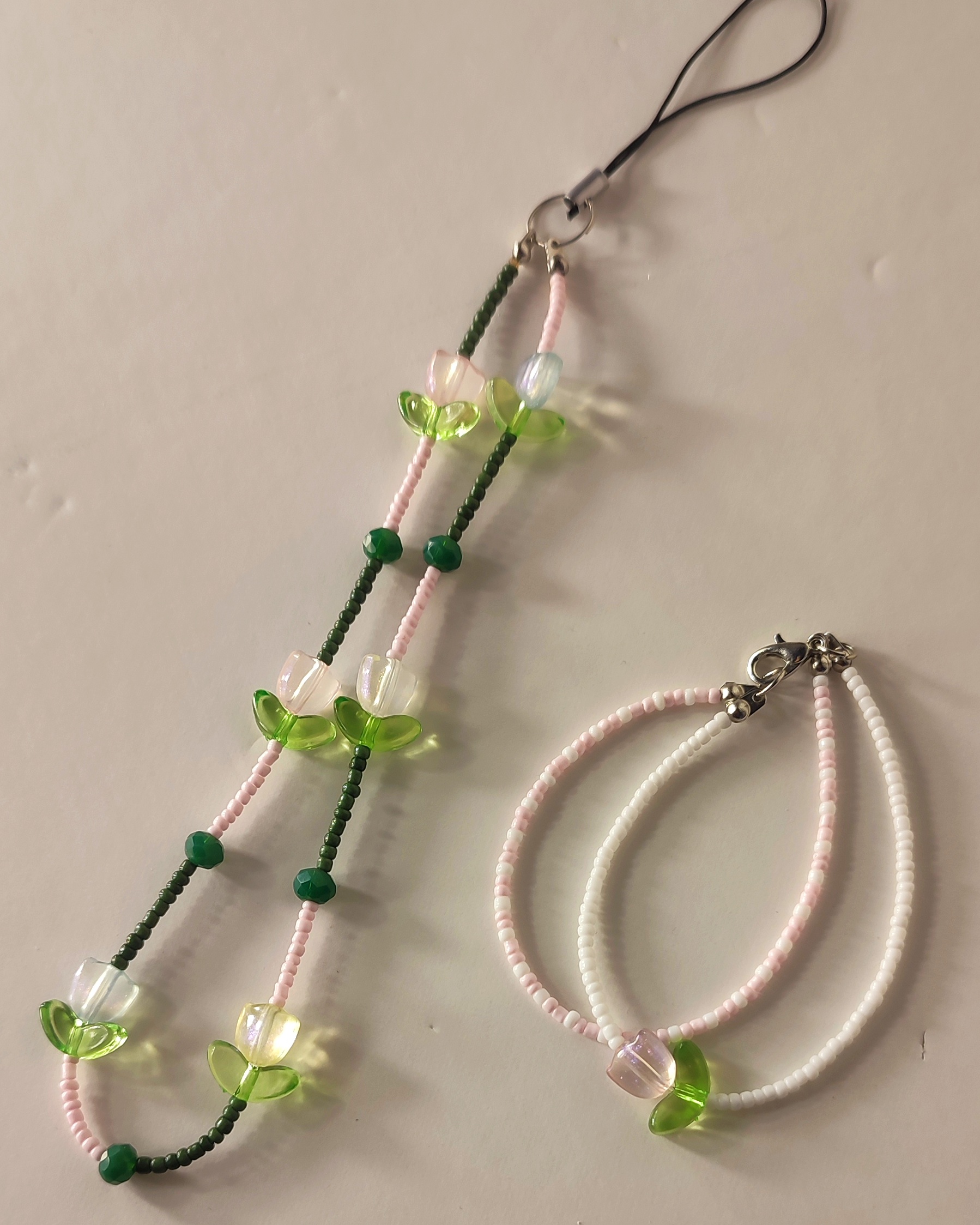 قابلیت ست کردن: این دستبند به گونهای طراحی شده که با آویز گوشی/کیف طرح لاله (که در تصویر هم مشخص است) یک ست کامل و جذاب را تشکیل میدهد.