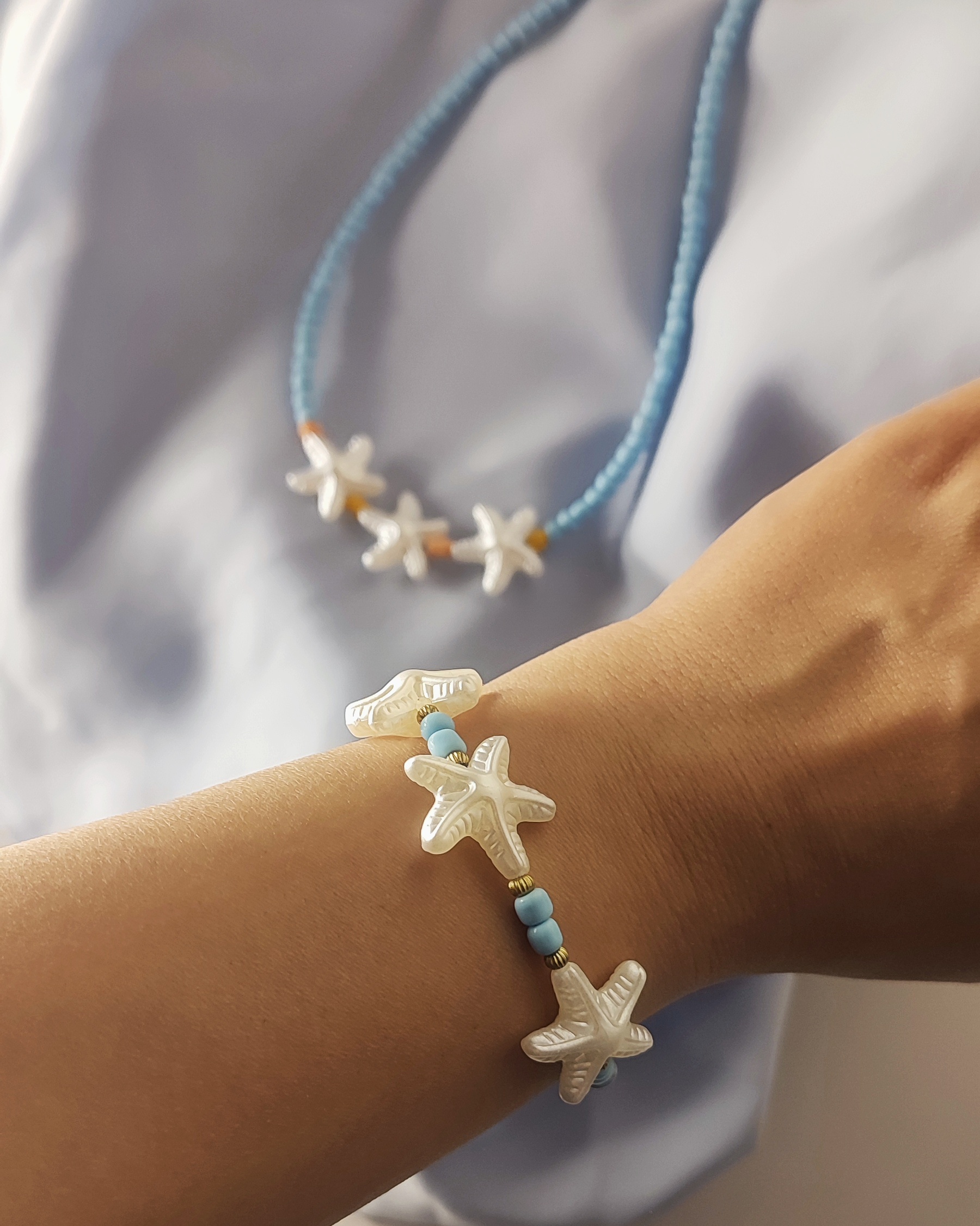 اگر به دنبال اکسسوری خاصی هستید که حس خنکی دریا و درخشش شنهای ساحل را تداعی کند، این ست دستساز مخصوص شماست. ترکیب رنگ آبی آسمانی ملایم با ستارههای دریایی صدفی، استایلی شاداب و باطراوت برای شما میسازد.